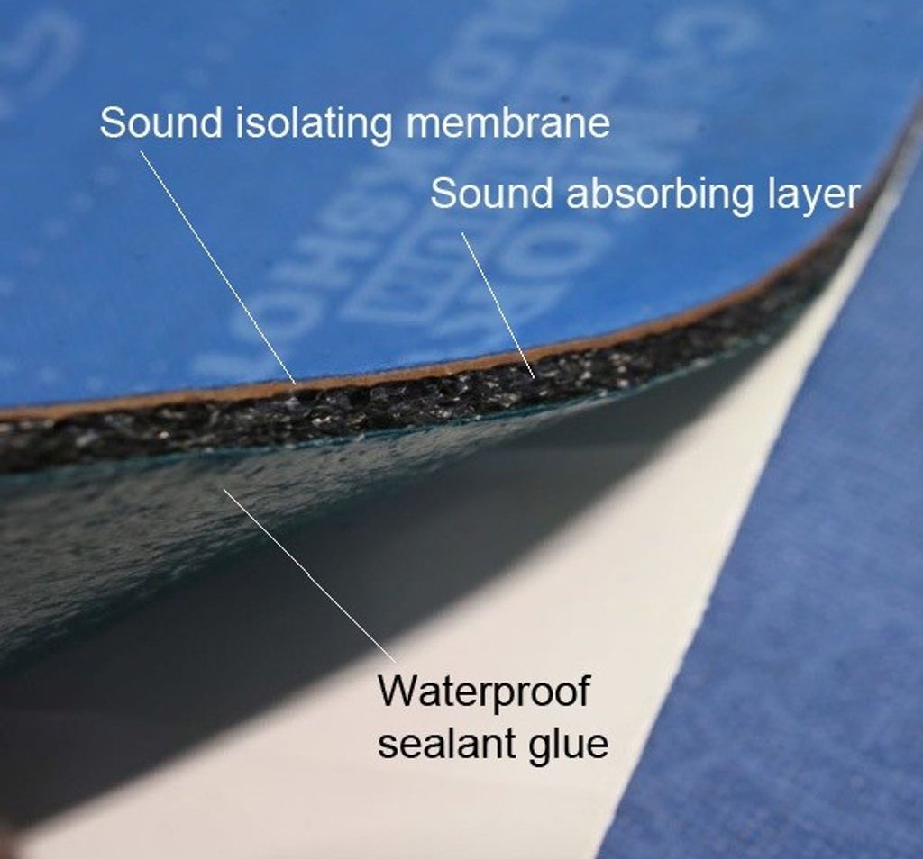 Den består av 3 lager: ett membran med akustisk mastik med hög densitet, ljudabsorberande material och självhäftande tätningsmedel.