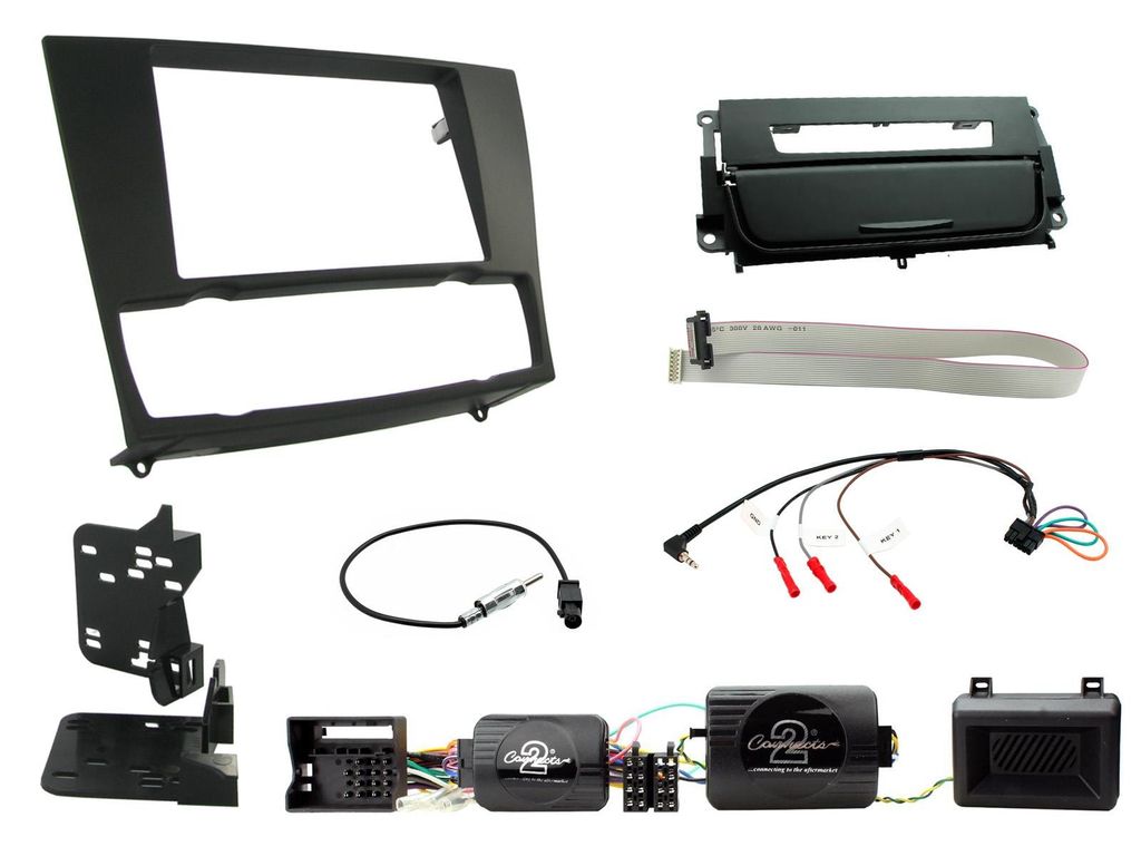 BMW Installationssats. Levereras med svart dubbel DIN ram, Piano Black Askfat Button Relocation Kit, FAKRA antennadapter, CAN-Bus rattkontroll och parkeringssensorhållningsgränssnitt & Universal Patchlead