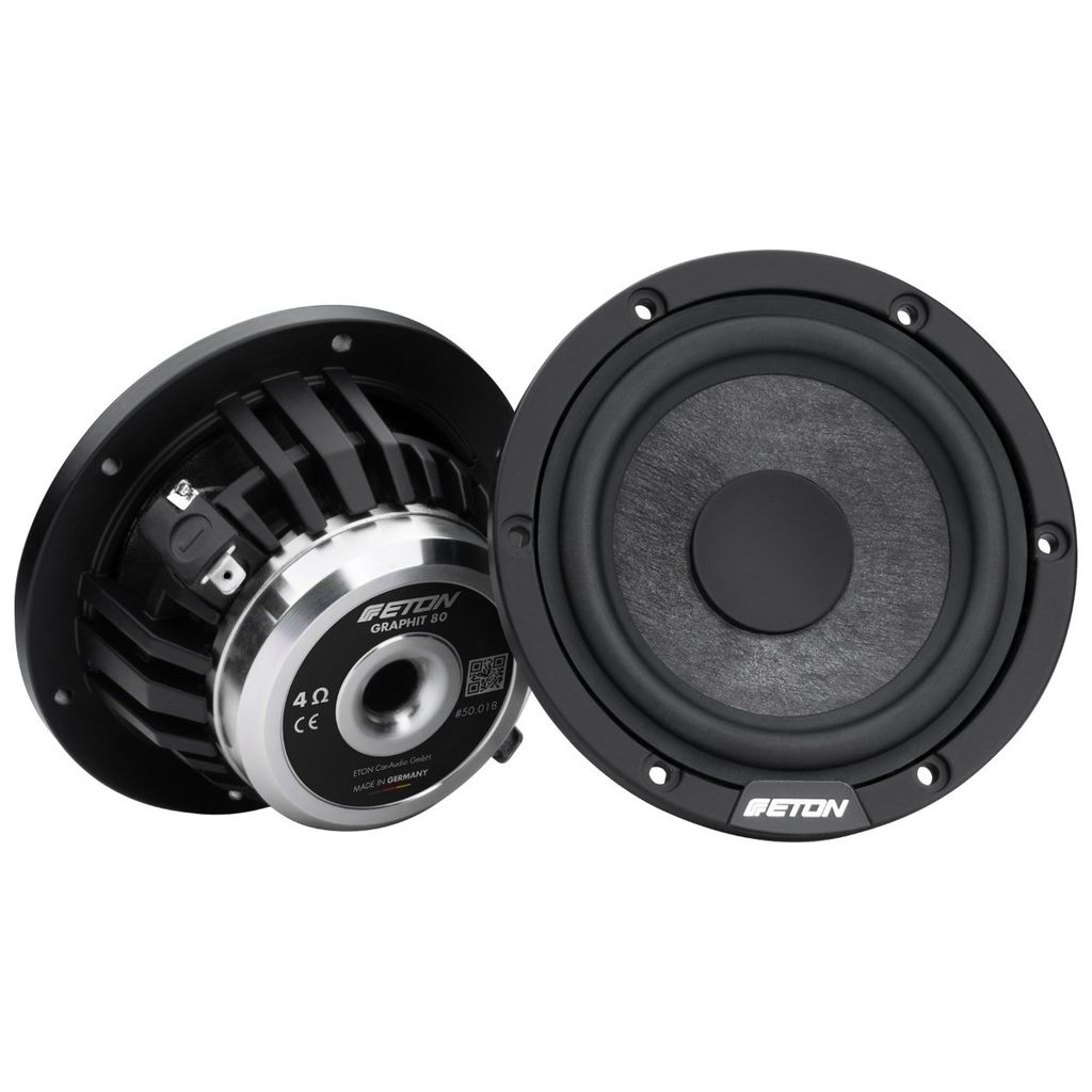 80 mm (3") High-end mellanregisterdriver med nyutvecklat kolfleece-sandwichmembran och stark neodymmagnet med kärnborrning för bästa möjliga kylning. Den högkvalitativa, vridningsbeständiga pressgjutna aluminiumkorgen möjliggör impulstrohet och ljudåtergivning med låg distorsion.