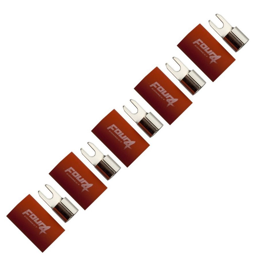 4Connect gaffelkontakter har krymprör av god kvalitet som isolator istället för vanliga gummi- eller plasthylsor. Krymprör skyddar anslutningen mycket bättre mot oxidation än lösa plast- eller gummihylsor. Många tillverkare tillverkar sina terminaler av mässing som har mer motstånd än koppar eftersom mässing är mycket billigare. Med anslutningar med hög ström skulle det vara klokt att använda äkta koppar för att säkerställa bästa anslutning och ledningsförmåga. Alla 4Connect-terminaler som är avsedda för 20 mmq eller större kablar är gjorda av 100% koppar. Kontaktdon är rodierade för att säkra anslutningen i flera år. Detta paket innehåller 5 st röda kontaktdon som passar till M4-bulten och tar 20 mm2-kabel.