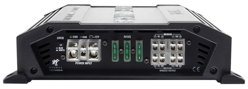 Den borstade, gråa aluminiumkylflänsen är en fröjd för ögat i sig. De svarta gjutna aluminiumgavlarna understryker också värdet av ZEUS EVOLUTION ZXEserier. Den visuella höjdpunkten är den upplysta HiFonics-logotypen, som kan växlas från blå till vit. Men inte bara logotypen är upplyst, ström- och högtalaranslutningarna lyser också i HiFonics-blått och ger ytterligare en visuell höjdpunkt.