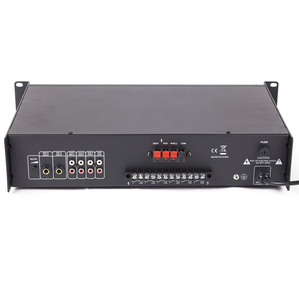 - Högtalarutgångar: 70/100 V eller 4/16 ohm, vilket ger flexibilitet för anslutning till olika högtalarsystem och konfigurationer.