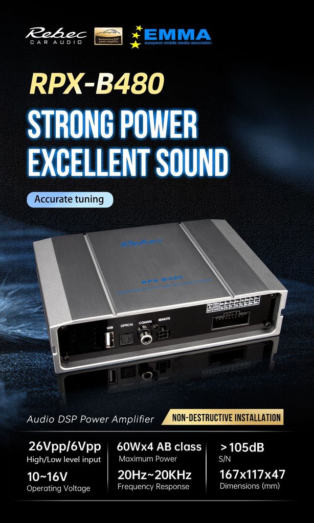 Rebec RPX-B480 är en 4-kanals förstärkare i klass AB som kombinerar kraft, klarhet och ljudkvalitet i ett kompakt format. Med sitt naturliga och dynamiska ljud lämpar den sig perfekt för SQL-byggen där både detaljrikedom och tryck prioriteras. Förstärkaren är konstruerad för att leverera stabil effekt vid 4 ohm och klarar höga insignalnivåer från både RCA och högnivåingångar, vilket gör den enkel att integrera i både original- och eftermarknadssystem.