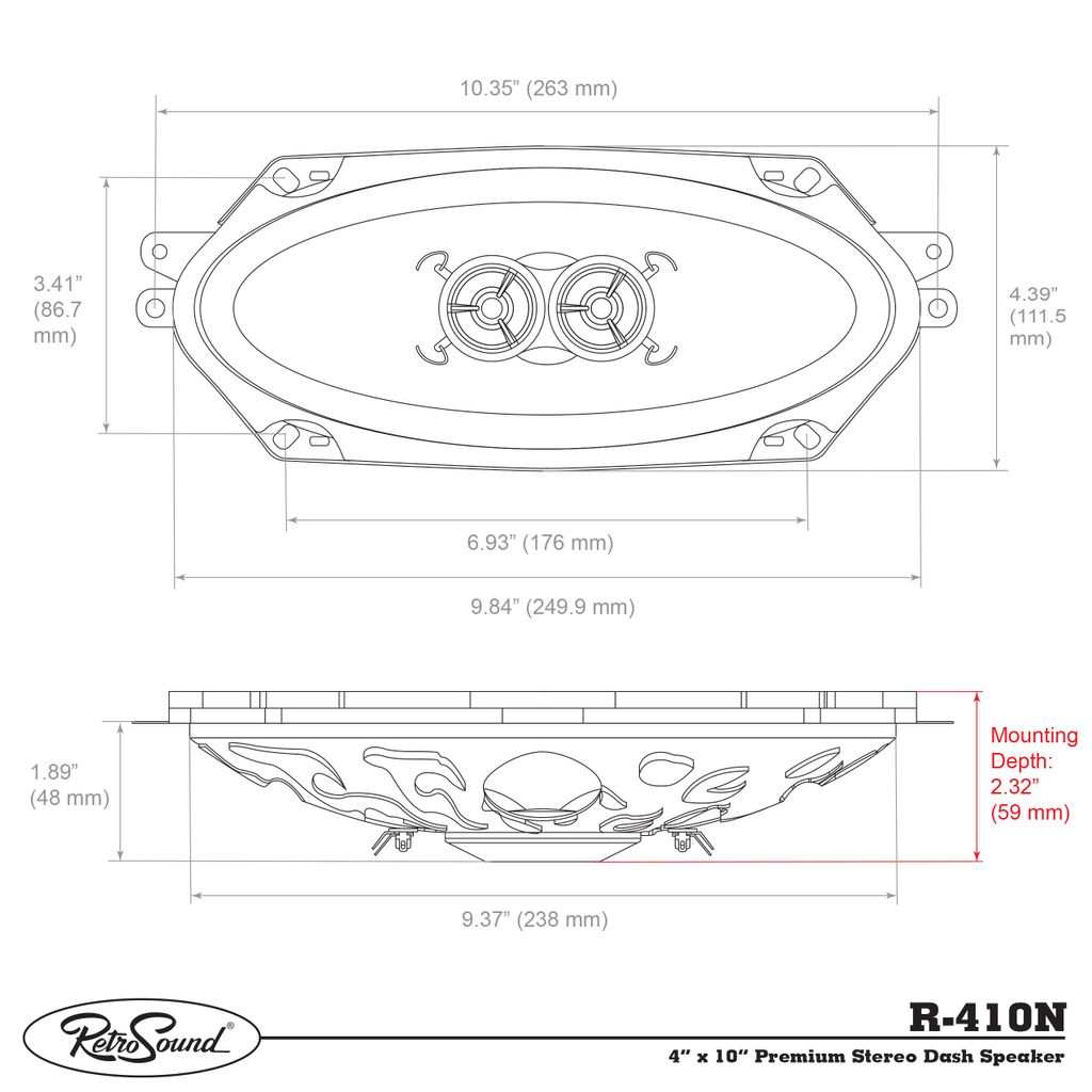 Denna 4x10" högtalare har ingen grill och är designad och dimensionerad för att passa i en OEM-plats, på grund av dess ultratunna monteringsprofil kan du montera den på platser där andra högtalare inte får plats. Observera att du köper ONE 4 x 10" Dual Voice Coil-högtalare, som är en fullsortimentshögtalare med en infälld 2-vägs dubbel Mylar-diskantenhet, Dual Voice Coil-system, styv massakompositkon, Santoprene surround, 1,77" ultratunt monteringsdjup och specialbearbetad kromkorg med lågt kolstål. (OBS: dessa och andra moderna högtalare är i allmänhet inte för användning med originalradio om de inte kan hantera 4 eller 8 ohm impedansbelastningar)
