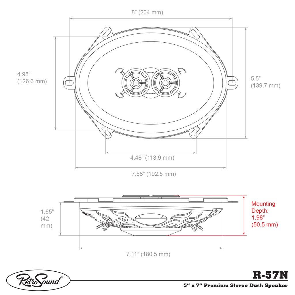 Retrosound RetroMod-serien av högtalare är designad och bearbetad från grunden och möter kraven från dagens högpresterande förstärkare samtidigt som de bibehåller fabriksdimensionerna för originalmontering och är kompatibla med alla digitala musikkällor. "N"-serien har ultratunna 1,77" monteringsprofiler för att passa i praktiskt taget alla installationsapplikationer. Denna högtalare har neodymmagnetstrukturer som är 5 gånger kraftfullare än vanliga högtalarmagneter, vilket möjliggör en avsevärd minskning av monteringsdjupet och har förbättrad effekthantering och värmeavledningsegenskaper.
