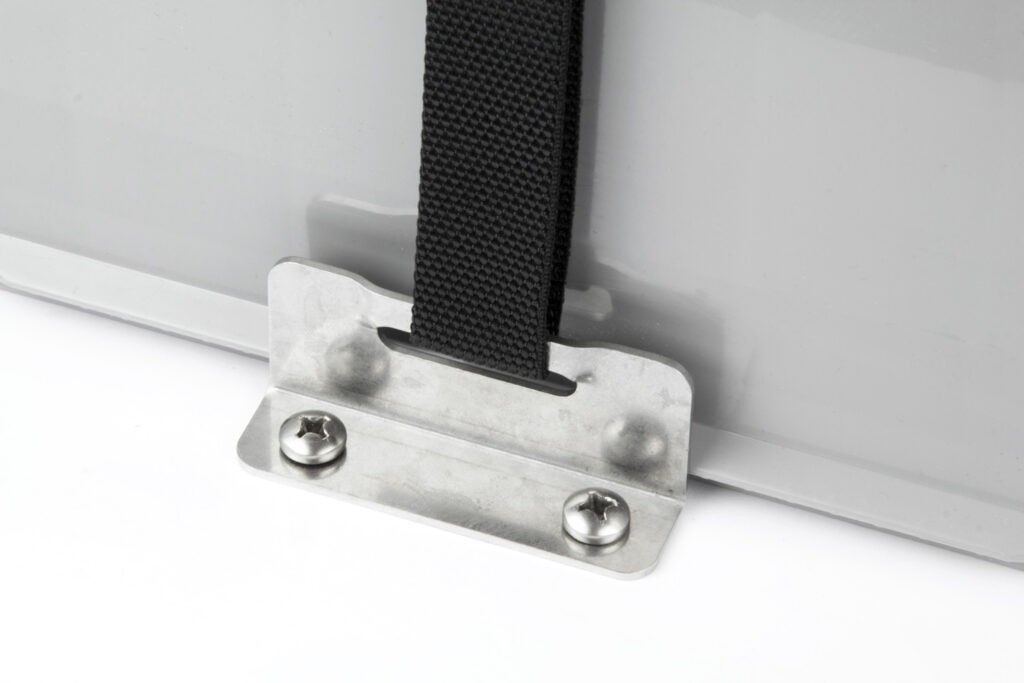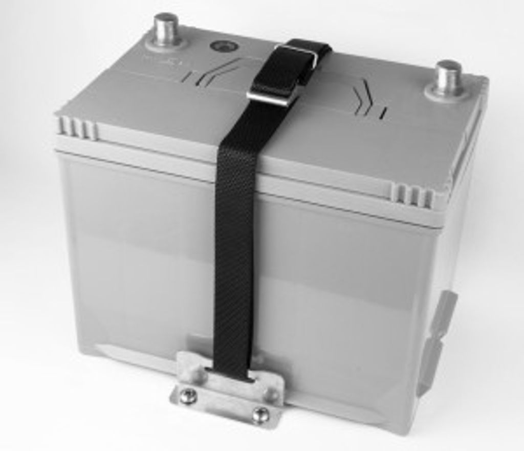Förpackningen innehåller två rostfria fästen och en rem som används för att fästa två batterier. Rejäla rostfria fästskruvar medföljer.