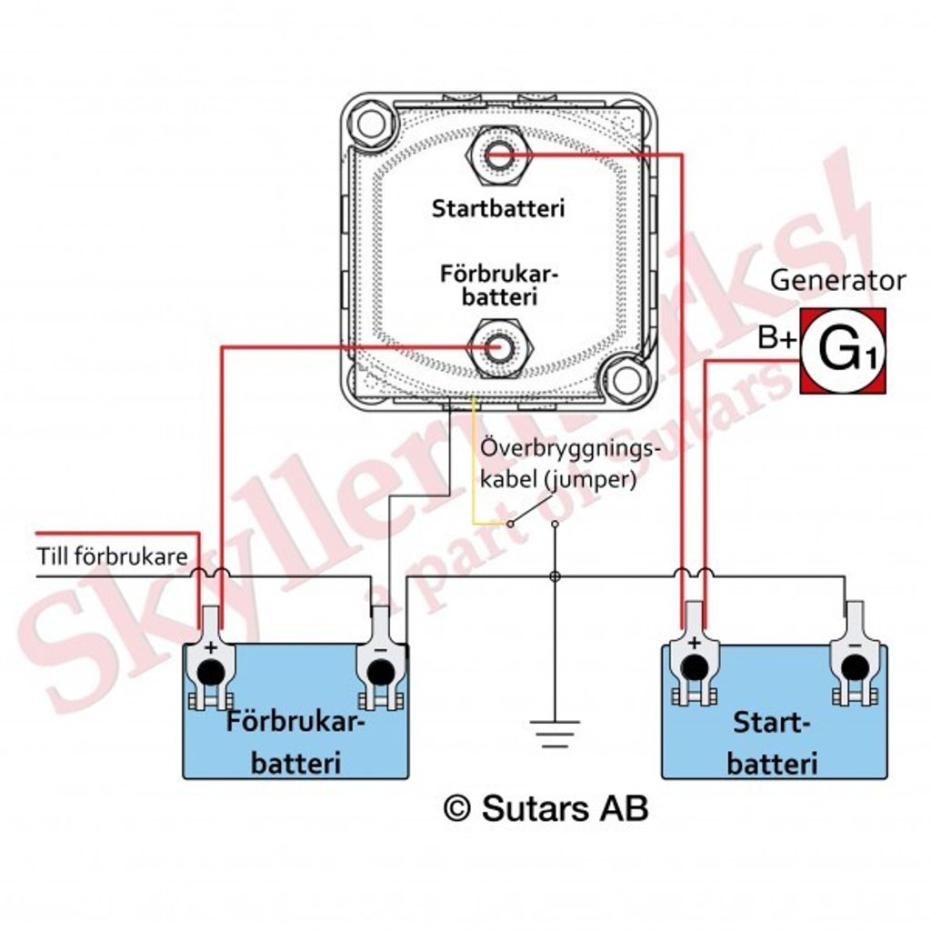 För att vara säker på att alltid kunna starta motorn bör du se till att startbatteriet skiljs från förbrukarbatterierna automatiskt när motorn står still. Den mest robusta lösningen för detta är att använda ett skiljerelä av god kvalitet och komplettera med ordentliga kablar