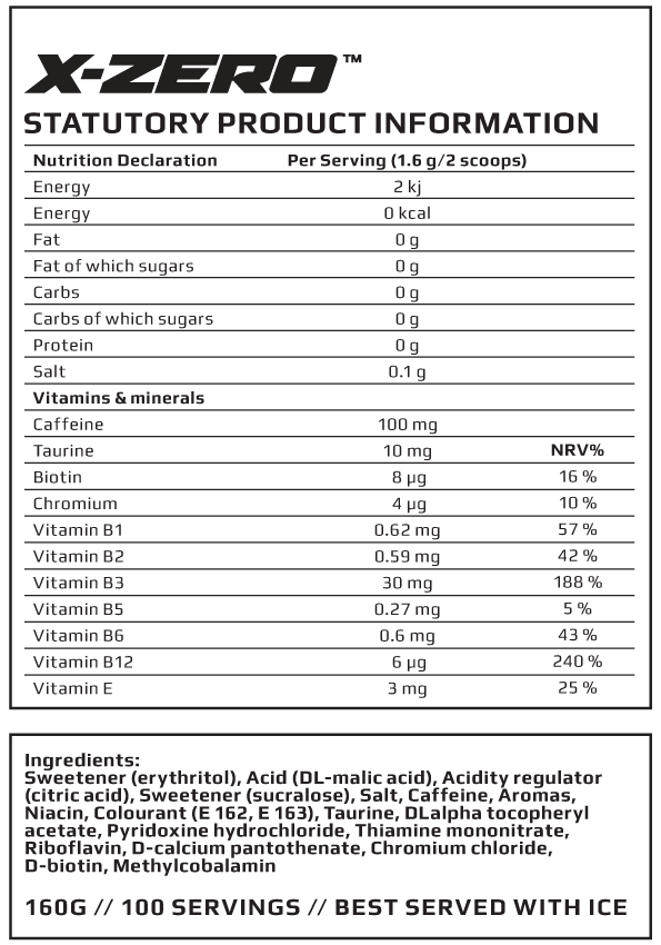 Varje servering innehåller 100 mg koffein, vilket hjälper dig att hålla fokus och energi under hela dagen. Den naturliga smaken i kombination med noll socker och noll kalorier gör X-Zero Blackberry till det självklara valet för dig som vill njuta utan att kompromissa med din livsstil.