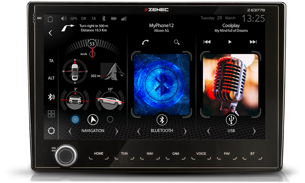 Z-E3776 är ett topputrustat multimediasystem med DAB+ dubbeltuner, FM-bilradio, gjord för iPod/iPhone, två USB-portar, HDMI och tre kameraingångar med mikrofonljud. Förutom att ringa telefonsamtal och streama musik stöder det integrerade Bluetooth-systemet även BT-SRC-läge: Detta innebär att signalerna från Z-E3776:s ljudkällor kan strömmas trådlöst till Bluetooth-högtalare i och utanför ditt fordon och bekvämt styras med ZENEC SP-REM smartphone-app.